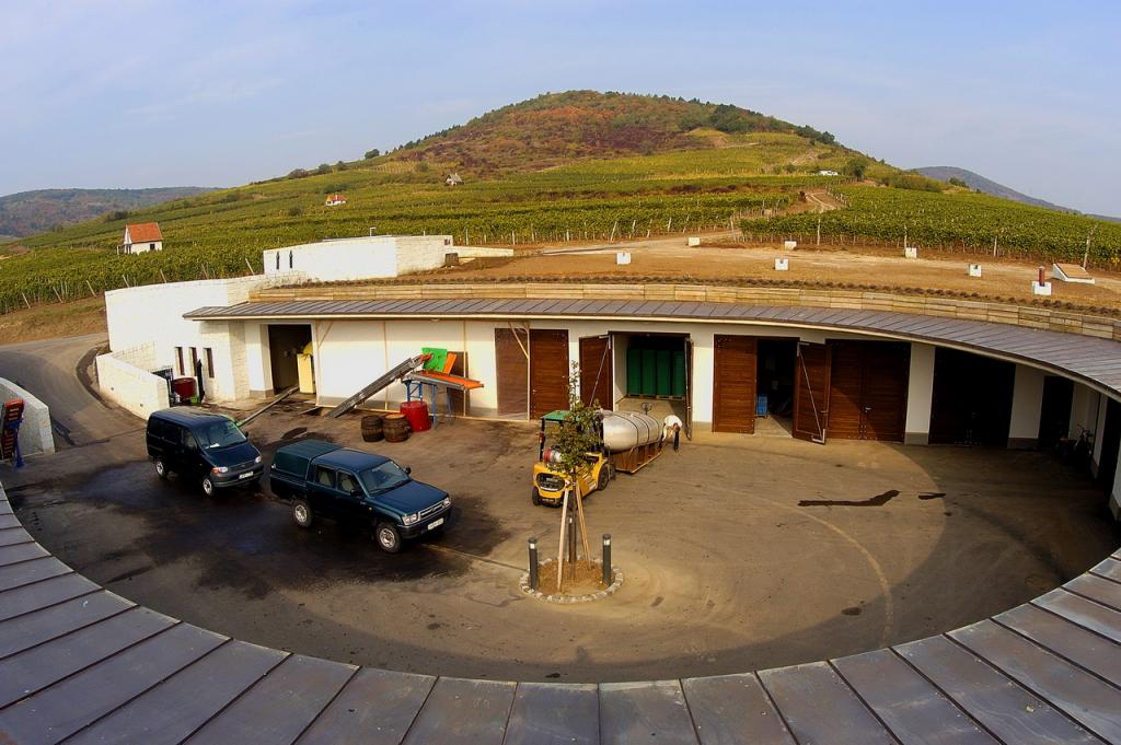 A feldolgozó üzemi épülete nem kíván konkurálni a borházzal, avval ellentétben nem épületként jelenik meg, hanem a szőlőhegyek támfalait, kő bástyáit, katlanjait megidéző terepalakulat mögé rejtőzik. A zöld dombok és rézsűk alatt, a terméskő támfalak mögött, egy földbe süllyesztett udvar köré szervezve helyezkednek el az üzemi terület helyiségei, egy húsz évvel ezelőtt épült föld alatti erjesztőcsarnokhoz kapcsolódva. Ebből a földel fedett világból csak a szőlőfogadó bejárat és a feldolgozás felső szintje emelkedik ki, egyfajta bástyaként, utalva a szőlőkben a kihordott kőből épült -bástyának nevezett- kődombokra és az egykori várra. A feldolgozó legalsó szintjéről indulnak a földbe vájt pincék, ahol a kincset érő nemes borokat, az aszút, a szamorodnit, a fordítást és egyéb jó dolgokat tárolják.