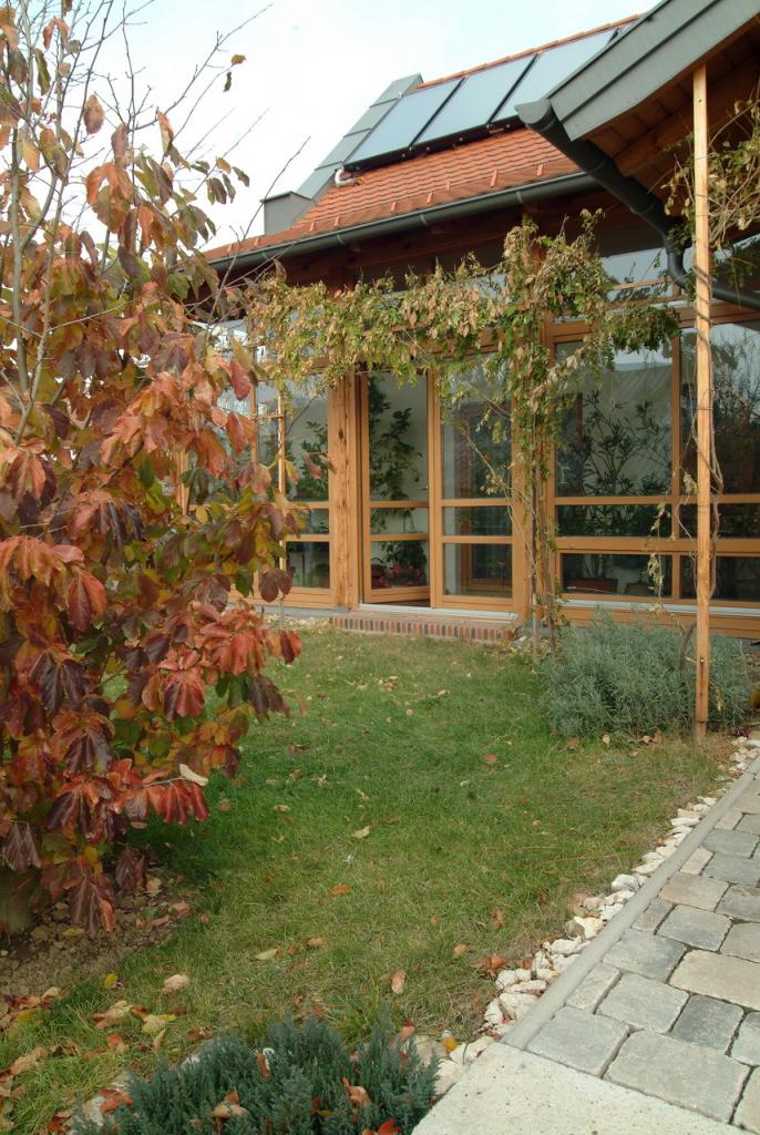 Az épület a passzív és aktív napenergiát hasznosítja, a tornác építészeti hagyományának megújításával. Ennek megfelelően az alaprajzon a mellékhelyiségek az északi fronton helyezkednek el, a lakószobák déli tájolásúak. Előttük tornác és télikert épült, ami a téli hőveszteséget csökkenti és passzív hőnyereséget okoz. A napvédelemről külső árnyékolás, kinyúló párkányok, a tornác és az átszellőztethető télikert gondoskodik, az épületnek nincs szüksége klímaberendezésre.